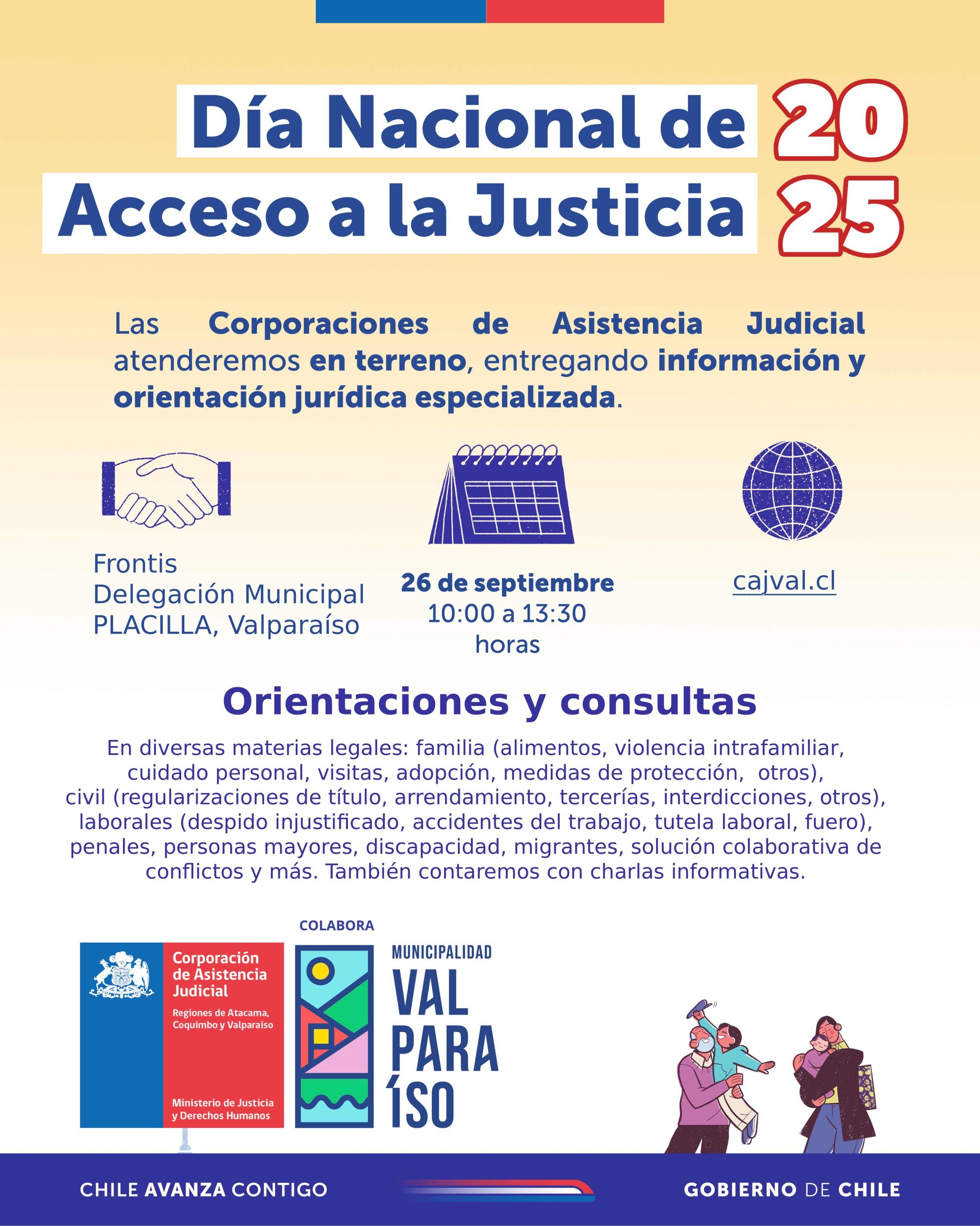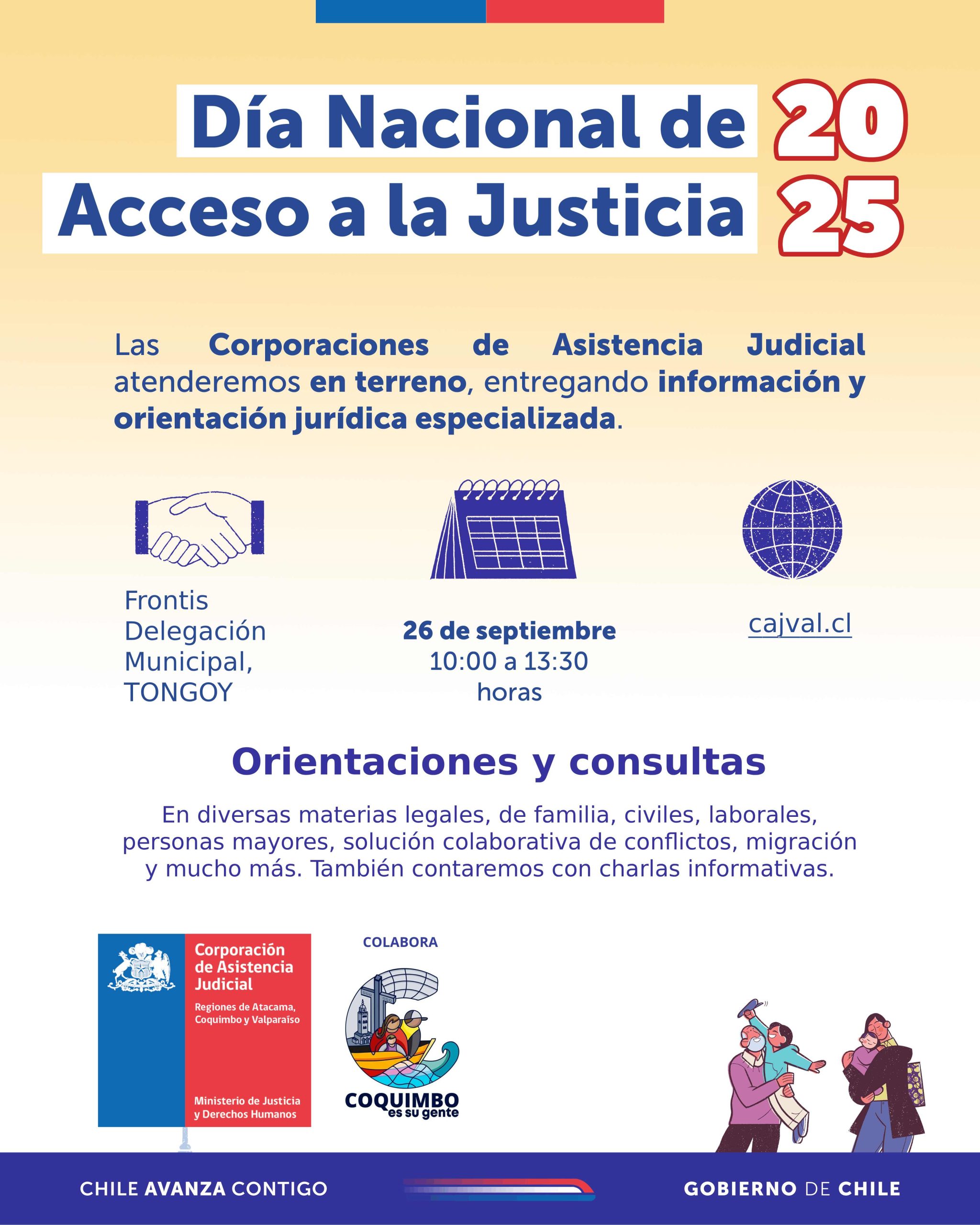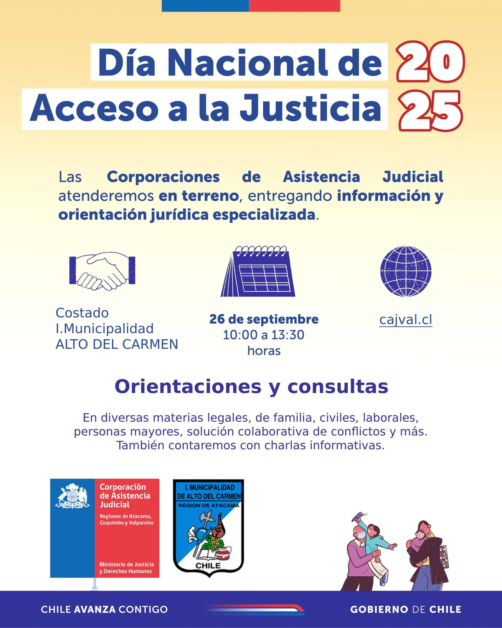 En el marco del Día Nacional de Acceso a la Justicia, las Corporaciones de Asistencia Judicial se desplegarán en distintos puntos del país para acercar los servicios y líneas especializadas a distintas comunidades. La jornada, simultánea en todo el territorio nacional, se realizará el día viernes 26 de septiembre e incluye atención en terreno además de charlas informativas en distintas materias, las que se llevarán a cabo en establecimientos escolares, juntas de vecinos, centros de salud, entre otros.